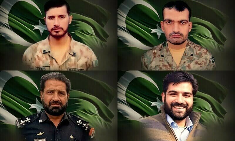 تاہم دہشت گردوں کے ساتھ شدید فائرنگ کے تبادلے کے دوران مٹی کے چار بہادر بیٹے پاک فوج کے سپاہی محمد ادریس (عمر 34 سال، رہائشی ضلع صوابی)، سپاہی بدام گل (عمر 34 سال، رہائشی ضلع کوہاٹ)، محکمہ انسداد دہشت گردی خیبر پختونخوا کے سب انسپکٹر تاجمیر شاہ (عمر 38 سال، رہائشی ضلع پشاور) اور اسسٹنٹ سب انسپکٹر محمد اکرم (عمر 34 سال، ساکن ضلع مانسہرہ) نے بہادری سے لڑتے ہوئے شہادت کو گلے لگا لیا۔