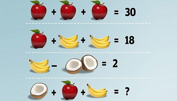 ویسے اس کا جواب 14 ہے یعنی ایک سیب (10)، تین کیلے (3) اور آدھا ناریل (ایک) کو جمع کرنے پر 14 جواب آئے گا۔