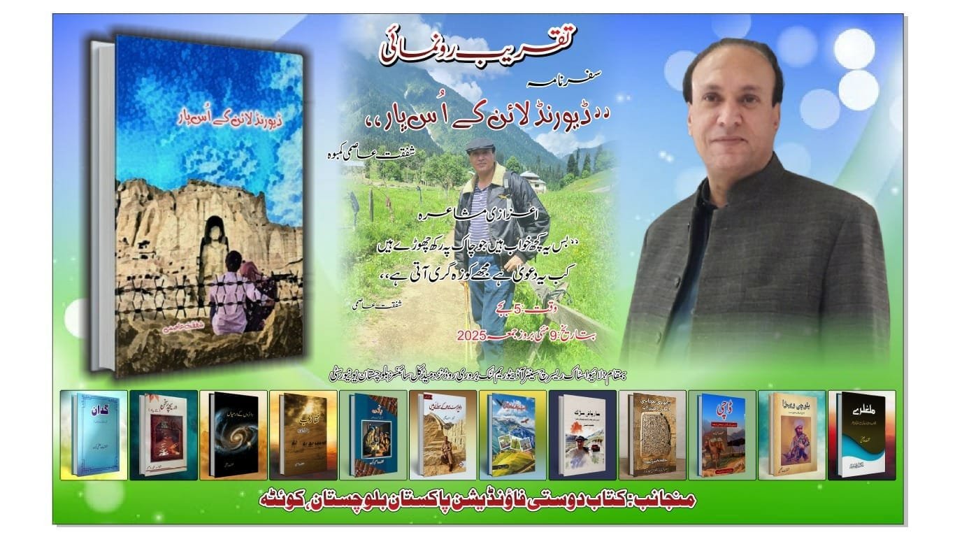 کتاب دوستی فاؤنڈیشن پاکستان ، بلوچستان کے زیرِ اہتمام ملک کے ممتاز سفر نامہ نگار ، شاعر ، محقق اور مترجم جناب شفقت عاصمی کمبوہ کے منفرد سفر نامہ ” ڈیورنڈ لائن کے اٌس پار ” کی تقریب رونمائی اور اعزازی مشاعرہ کا انعقاد کیا جا رہے ہے جس میں آپ کو شرکت کی دعوت دی جاتی ہے۔ امید ہے کہ آپ نہ صرف تقریب کو رونق بخشیں گے بلکہ اپنے(شعرا کرام) کلام سے بھی سامعیں کو محظوظ کریں گے ۔