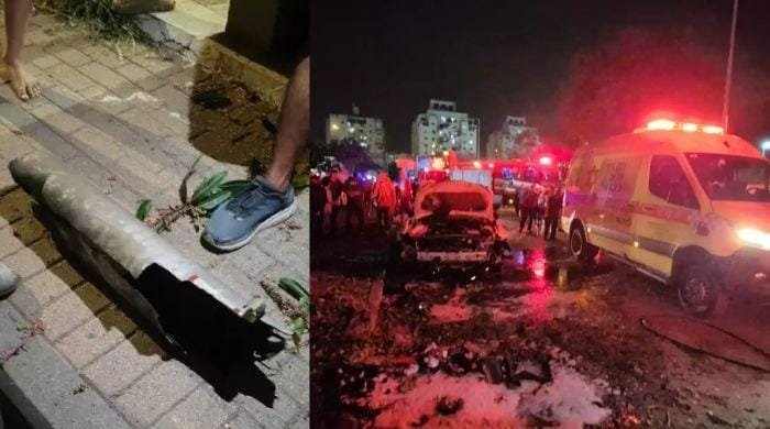 اسرائیلی میڈیا کی جانب سے جاری کی جانے والی تصاویر اور ویڈیوز میں مقبوضہ شہر عسقلان میں راکٹ گرنے کے مناظر دکھائے گئے ہیں جن میں تباہ شدہ گاڑیاں نظر آرہی ہیں۔