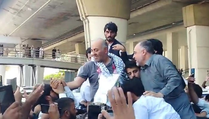 اسرائیلی حراست سے رہائی پانیوالے سابق سینیٹر مشتاق احمد کا پاکستان پہنچنے پر شاندار استقبال