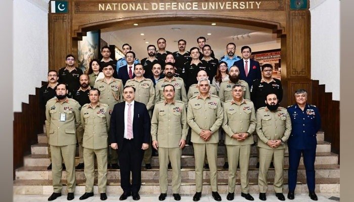 آئی ایس پی آر کے مطابق فیلڈ مارشل عاصم منیر نے نیشنل ڈیفنس یونیورسٹی اسلام آباد کا دورہ کیا۔ فیلڈ مارشل کو نیشنل سکیورٹی اینڈ وار کورس کے سول اور عسکری پینلز نے قومی سلامتی کو درپیش چیلنجز پر بریفنگ دی۔