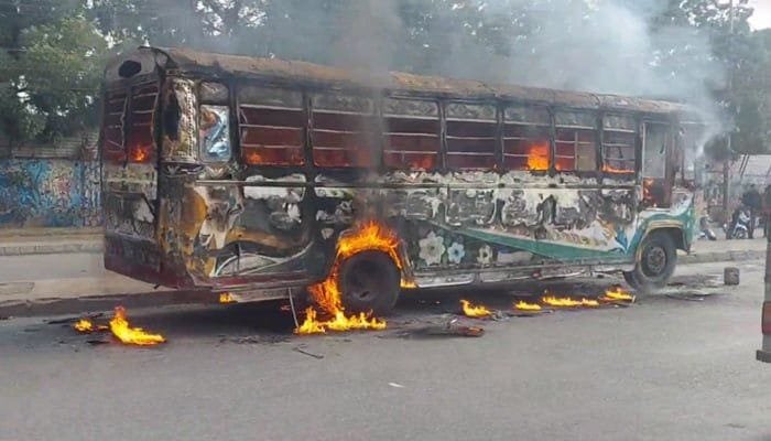 حادثے کے بعد بس ڈرائیور موقع سے فرار ہوگیا جبکہ مشتعل افراد نے مسافر بس کو آگ لگادی۔