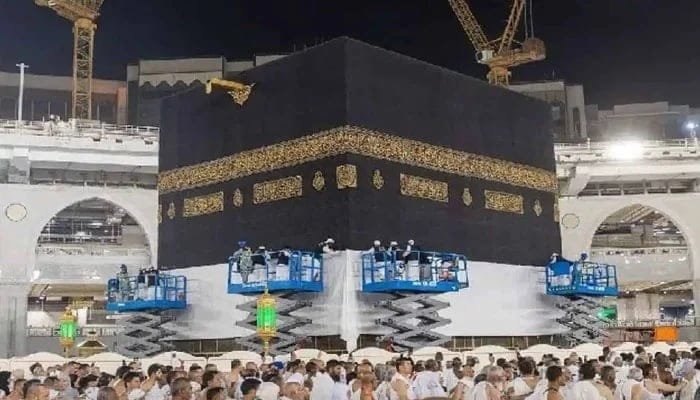ایام حج کی آمد سے قبل غلاف کعبہ کو زمین سے 3 میٹر اونچا کردیاگیا